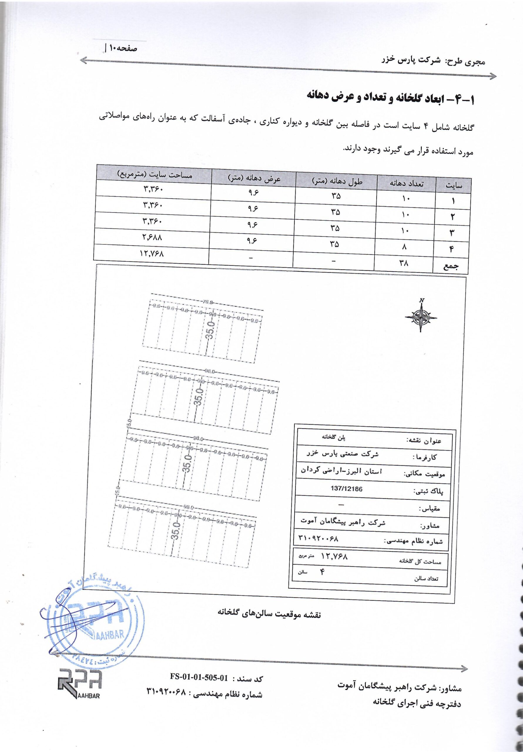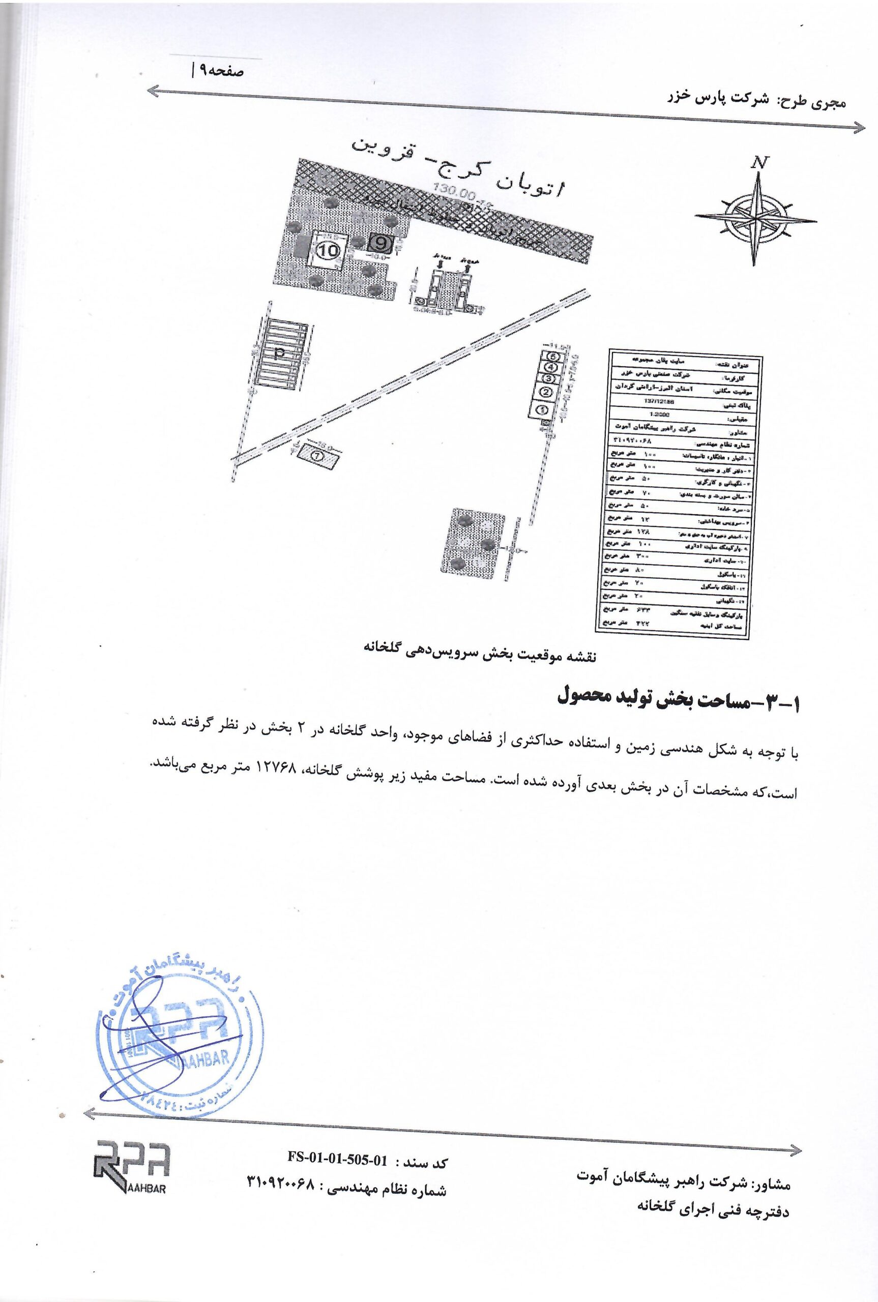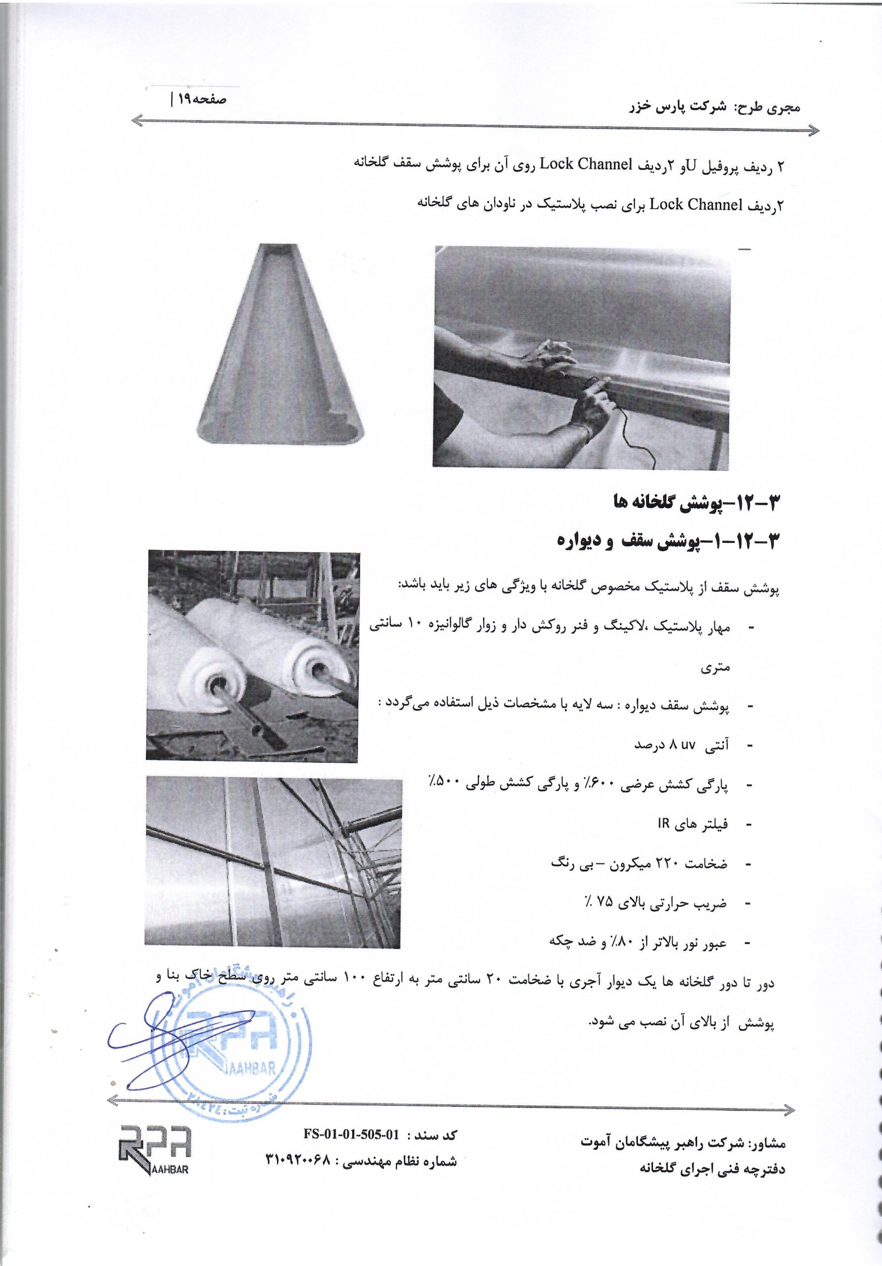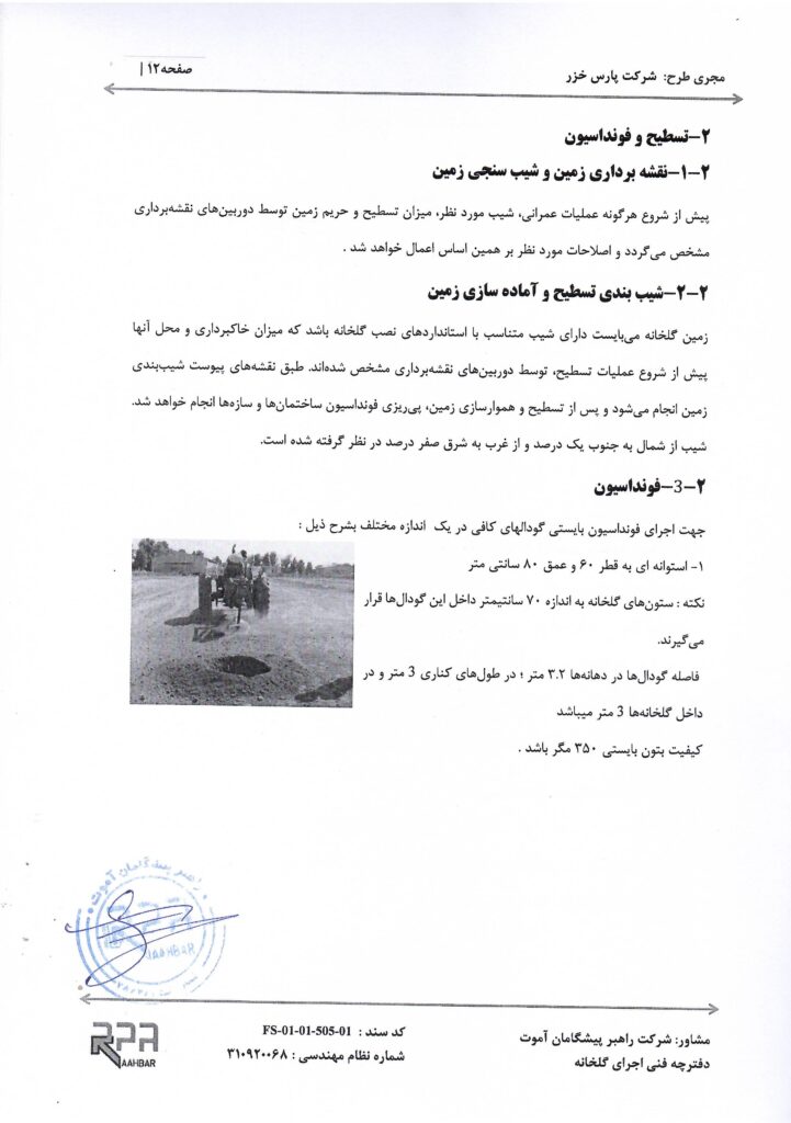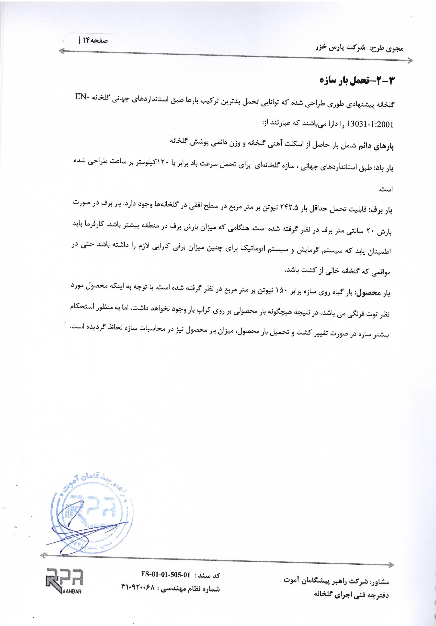 شرکت صنعتی پارس خزر (سهامی عام) در نظر دارد که یک واحد گلخانه به مساحت 12768 متر مربع را در شهرستان گلسار کرج احداث نماید. سازنده باید مورد تایید سازمان نظام مهندسی کشاورزی باشد.